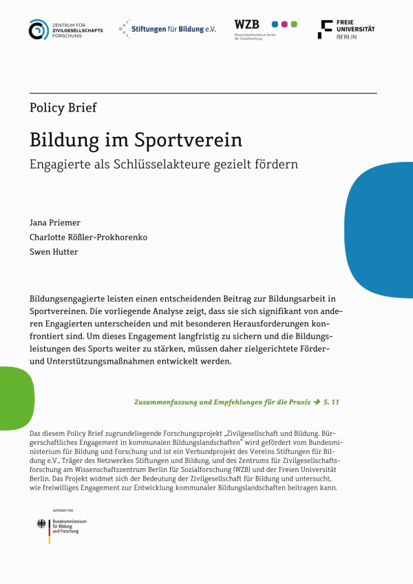 Bildung im Sportverein : Engagierte als Schlüsselakteure gezielt fördern / Jana Priemer, Charlotte Rößler-Prokhorenko, Swen Hutter. by Series: Policy Brief